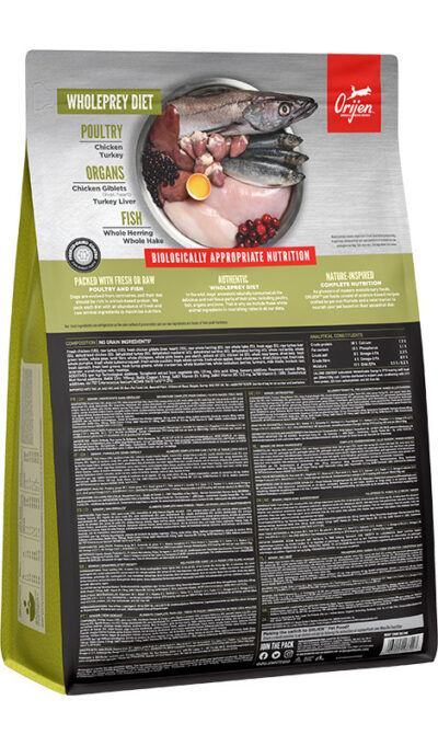 Orijen, jako karma Biologicznie Odpowiednia, stara się odwzorowywać jak najbardziej naturalną dietę psa, tak jak uczyniłaby to Matka Natura (nie inaczej jest w karmie Orijen Senior). Dlatego też karmy Orijen, bogate są w świeże, mięsne składniki, uzupełniane o owoce, warzywa i zioła. Właśnie dlatego w workach karmy znajdziemy aż 85% mięsa – bezkonkurencyjna ilość względem karm dostępnych na rynku. Między 38%, a 44% białka pochodzenia zwierzęcego. Karmy Orijen przygotowywane są z 8 różnych świeżych i surowych mięs, wszystko zgodnie z proporcją WholePrey™ (cała zdobycz), dzięki czemu organizm otrzymuje odżywcze i różnorodne białka i tłuszcze.