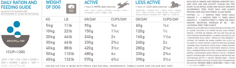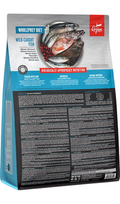 Orijen Six Fish to karma specjalnie stworzona z myślą o wszystkich psach psach. Opiera się ona o białko z ryb takich jak: sardynki, makrele, morszczuka, flądre, marmazyne i sole łowione z  krystalicznie czystych wodach Kanady. Idąc dalej, aby zapewnić naszemu psu jak najlepszy posiłek, w opakowaniu suchej karmy Orijen Six Fish, nie znajdziemy zbóż, ziemniaków, tapioki ani roślinnych koncentratorów białka. Pełna będzie ona mięsa, bo aż 85% składu, zaś warzyw, owoców i ziół znajdziemy w niej do 15%. Do tego 2/3 mięsa to mięso świeże, a tylko 1/3 to mięso dehydratyzowane w temperaturze 90˚C. Orijen Six Fish zawiera 38% odżywczego białka i jedynie 19% węglowodanów niskoglikemicznych. Wszystko po to aby nasz pies odżywiał się zgodnie z potrzebami biologicznymi.