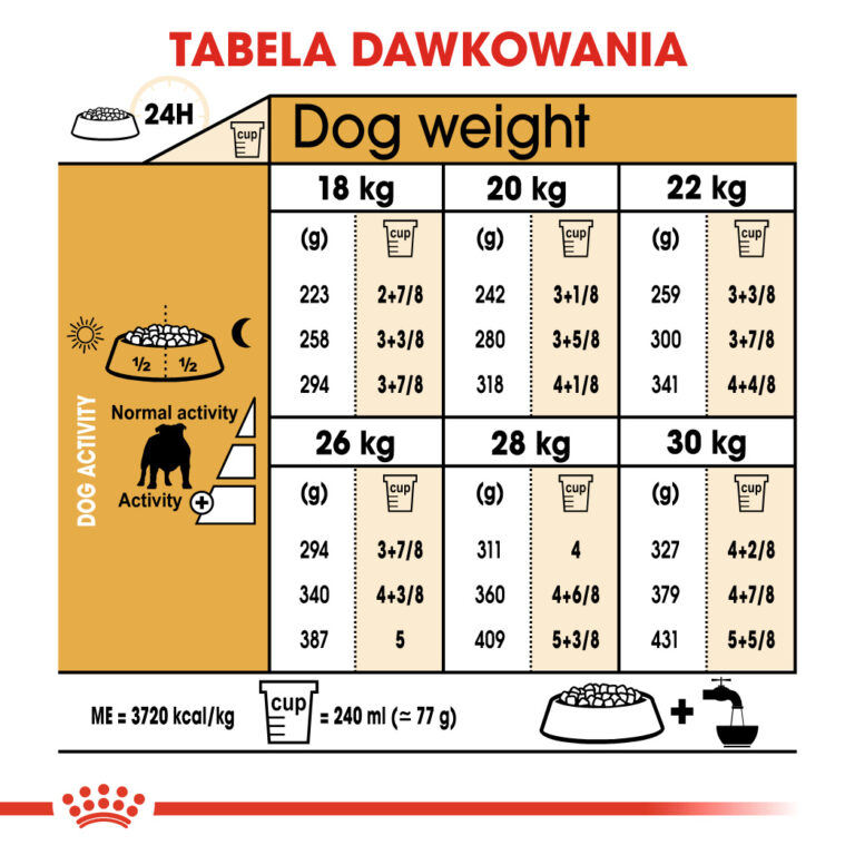 Ponieważ psy rasy buldog należą do grupy psów mało aktywnych, ich potrzeby energetyczne nie są wysokie. Karma ROYAL CANIN® Bulldog Adult charakteryzuje się umiarkowanym poziomem energii, co pomaga utrzymać optymalną masę ciała. Dodatkowo została wzbogacona o kwasy tłuszczowe omega 3, takie jak EPA i DHA. Składniki te sprzyjają zachowaniu zdrowych kości i stawów.