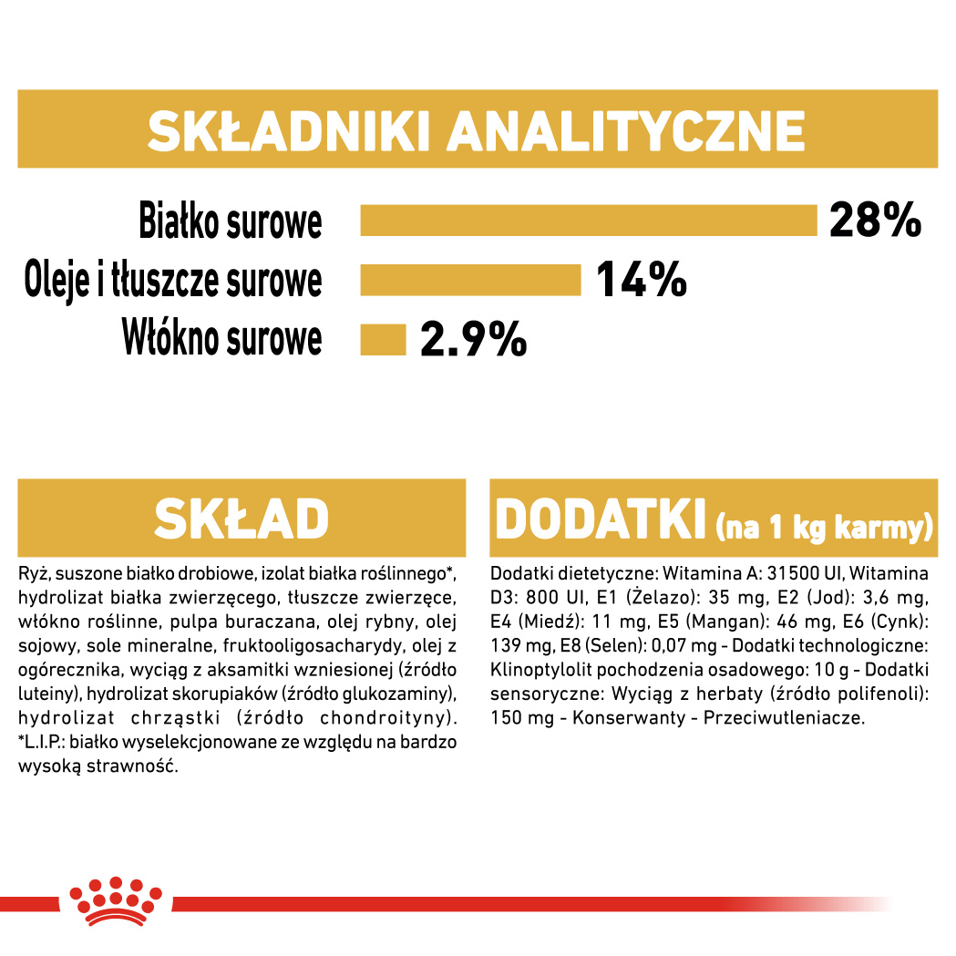 ryż, białko drobiowe (suszone), izolat białka roślinnego*, białko zwierzęce (odwodnione), tłuszcz zwierzęcy, lignoceluloza, suszone wysłodki buraczane, olej rybny, olej sojowy, minerały, fruktooligosacharydy, olej z ogórecznika lekarskiego, sproszkowany nagietek (źródło luteiny), hydrolizowane skorupiaki (źródło glukozaminy), hydrolizat z chrząstek (źródło chondroityny).