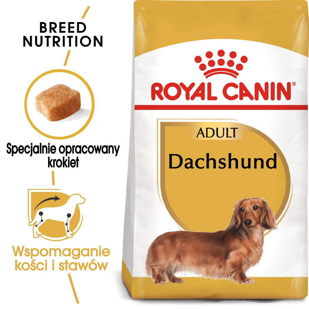 Karma ROYAL CANIN® Dachshund Adult została opracowana specjalnie dla dorosłych psów, powyżej 10 miesiąca życia, rasy jamnik. Karma sprzyja zdrowiu kości i stawów, dzięki precyzyjnemu zbilansowaniu składników mineralnych, w szczególności wapnia i fosforu. Receptura karmy pomaga utrzymać odpowiedni tonus mięśniowy oraz idealną masę ciała. Karma ROYAL CANIN® Dachshund Adult sprzyja także zmniejszeniu objętości oraz intensywności zapachu odchodów.