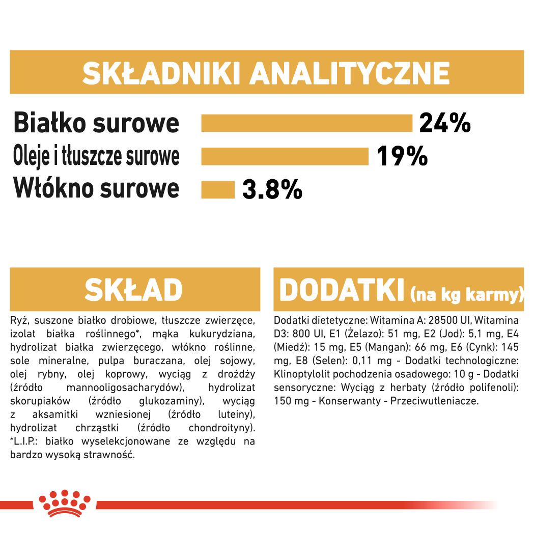 kukurydza, suszone białko drobiowe, mąka kukurydziana paszowa, tłuszcz zwierzęcy, pszenica, suszone białko wieprzowe, ryż, hydrolizowane białko zwierzęce, gluten kukurydziany, wysłodki buraczane, minerały, olej rybi, olej sojowy, drożdże, hydrolizowane skorupiaki (bogate w glukozaminę), hydrolizowana chrząstka (bogata w chondroitynę).