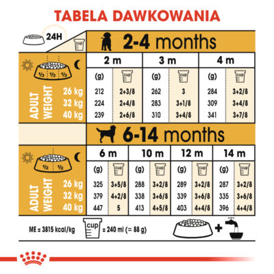 Karma ROYAL CANIN® Labrador Retriever Puppy została opracowana specjalnie dla szczeniąt rasy labrador retriever, do 15 miesiąca życia. Odpowiednio zbilansowany poziom energii, białka, wapnia i fosforu zapewnia prawidłowy przebieg mineralizacji kośćca. Sprzyja to także prawidłowemu wzrostowi i utrzymaniu odpowiedniej masy ciała. Wysokiej jakości białko (L.I.P) i prebiotyki sprzyjają zdrowiu przewodu pokarmowego i utrzymaniu równowagi flory bakteryjnej jelit. Sprzyja to także odchodom o prawidłowej konsystencji.