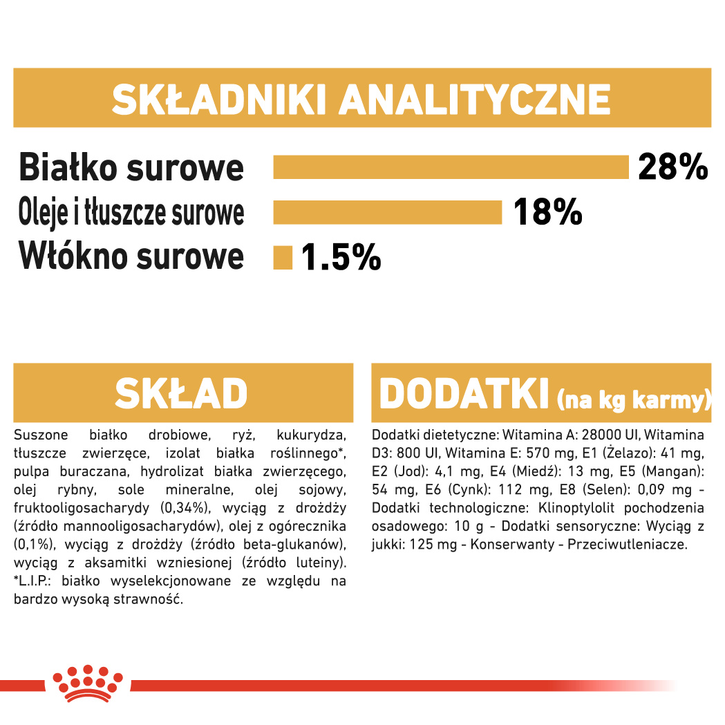 ryż, suszone białko drobiowe, kukurydza, tłuszcze zwierzęce, izolat białka roślinnego*, pulpa buraczana, hydrolizat białka zwierzęcego, sole mineralne, olej rybny, olej sojowy, fruktooligosacharydy, wyciąg z drożdży (źródło mannooligosacharydów), olej z ogórecznika (0,1%), wyciąg z aksamitki wzniesionej (źródło luteiny)