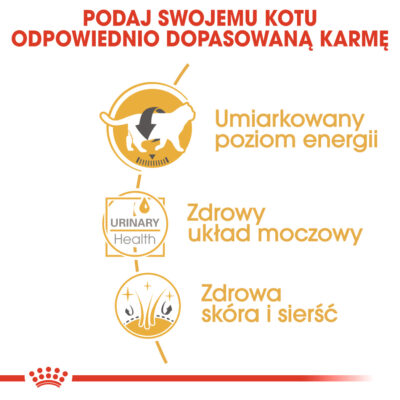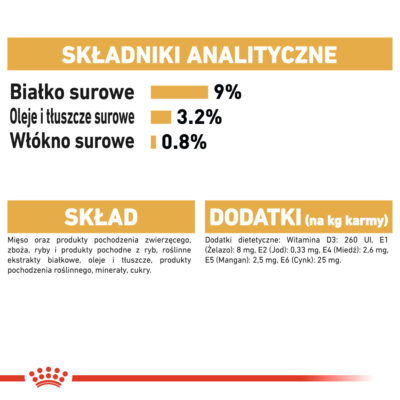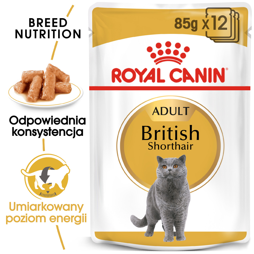 Karma mokra ROYAL CANIN® British Shorthair Adult została opracowana specjalnie dla kotów dorosłych powyżej 1 roku życia, rasy brytyjski krótkowłosy. Koty brytyjskie krótkowłose charakteryzują się mocną budową i silną muskulaturą. U kotów tej rasy udział masy mięśniowej powinien przeważać nad tkanką tłuszczową. Odpowiednie składniki pokarmowe i ich poziom, a także stosowanie się do zalecanego dawkowania, jest kluczowe.