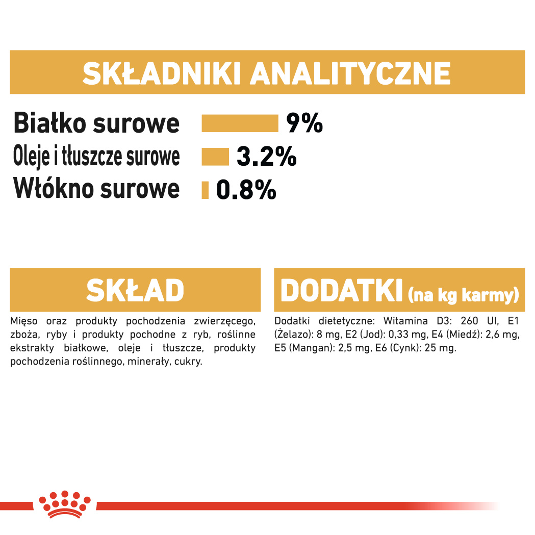 Karma charakteryzuje się umiarkowanym poziomem energii oraz dostosowanym poziomem tłuszczu (3,2%), co sprzyja utrzymaniu optymalnej masy ciała.