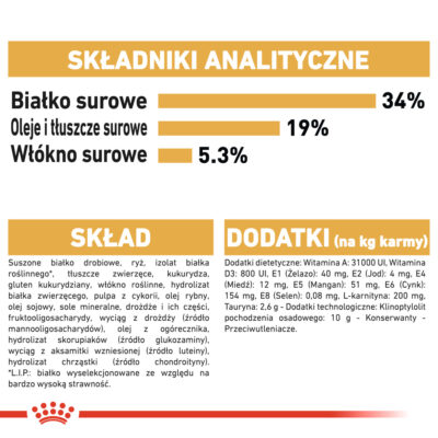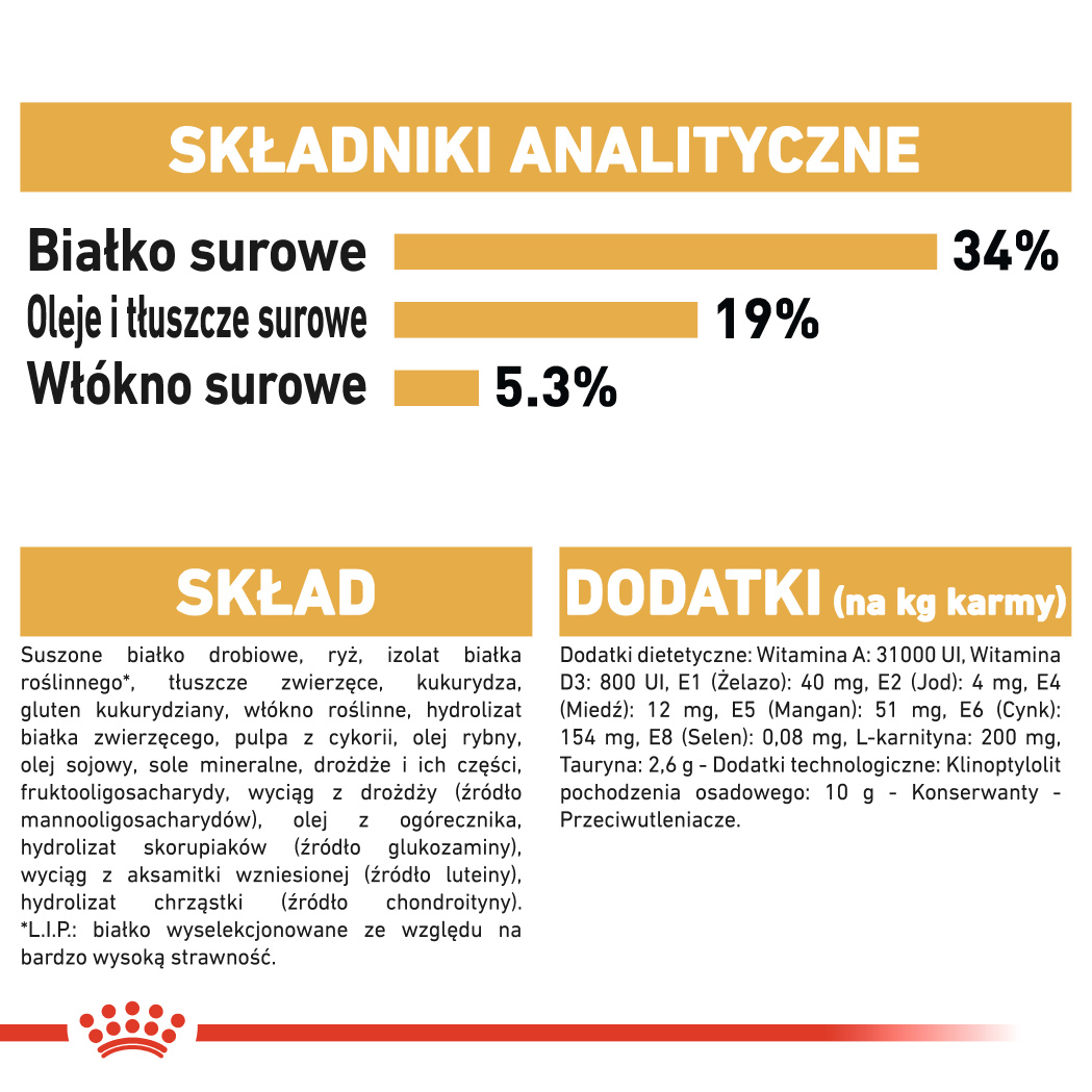 białko drobiowe (suszone), ryż, izolat białka roślinnego*, tłuszcz zwierzęcy, kukurydza, gluten paszowy kukurydziany, lignoceluloza, hydrolizowane białko zwierzęce, włókna cykorii, olej rybi, olej sojowy, składniki mineralne, drożdże i ich części, fruktooligosacharydy, hydrolizat drożdży [źródło mannanooligosacharydów], olej z ogórecznika lekarskiego, hydrolizat ze skorupiaków [źródło glukozaminy], mączka z kwiatu aksamitki [źródło luteiny], hydrolizat z chrząstki [źródło chondroityny]