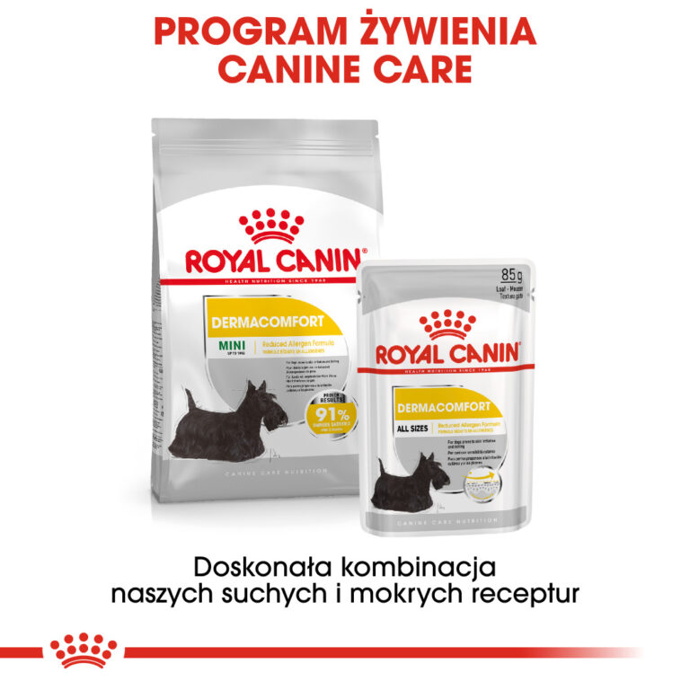 Royal Canin Dermacomfort jest karmą pełnoporcjową, przeznaczoną dla dorosłych psów ze skłonnością do podrażnień skóry i drapania się. W związku z tym formuła posiada specjalnie dobrane składniki, które pomagają utrzymać skórę w najlepszej możliwej kondycji. Receptura zawiera starannie wyselekcjonowane źródła rzadko alergizującego białka, co zmniejsza ryzyko nietolerancji. Dodatkowo zwiększona ilość kwasów Omega 3 i Omega 6 wspomaga łagodzenie podrażnień i ochronę skóry, zmniejsza jej wrażliwość na szkodliwe czynniki środowiskowe.