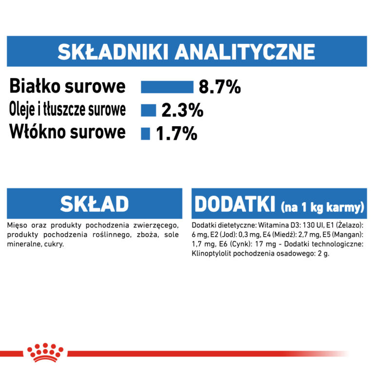 Dodatki (na 1 kg karmy): Witamina D3: 130 UI, E1 (Żelazo): 6 mg, E2 (Jod): 0,3 mg, E4 (Miedź): 2,7 mg, E5 (Mangan): 1,7 mg, E6 (Cynk): 17 mg - Dodatki technologiczne: Klinoptylolit pochodzenia osadowego: 2 g.