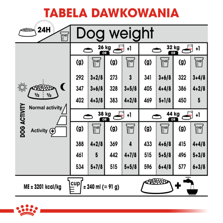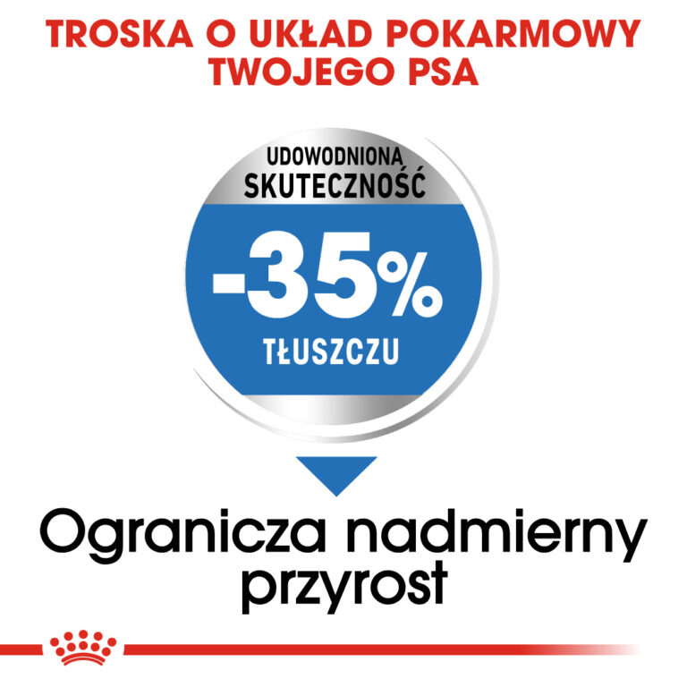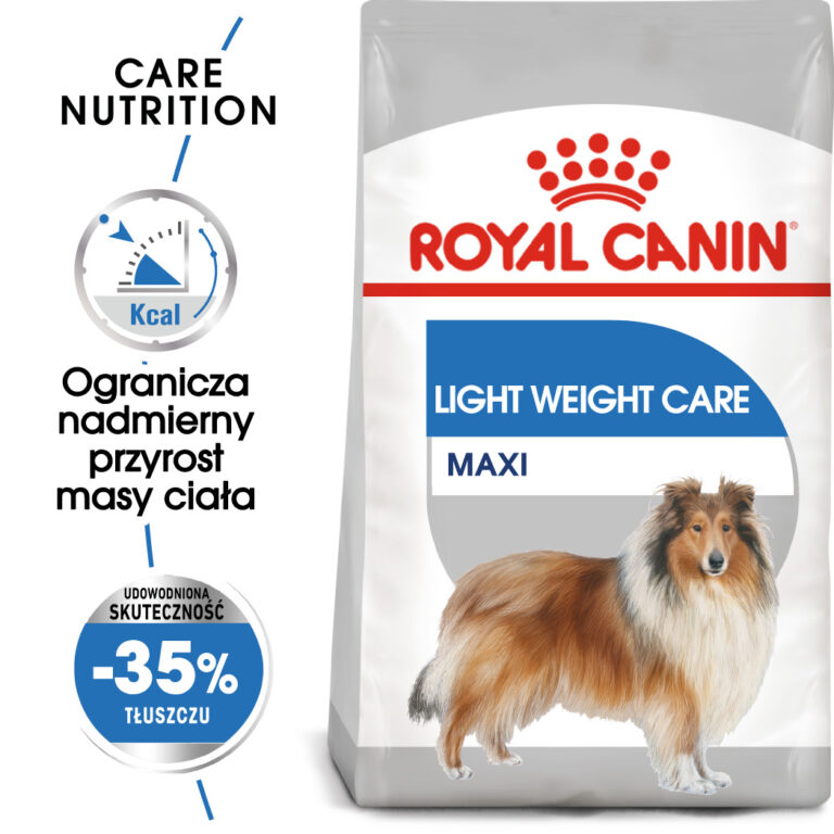 Karma ROYAL CANIN® Light Weight Care Maxi, odpowiednia dla psów dorosłych o masie ciała od 26 do 44 kg, powstała, by wspomagać dobre samopoczucie Twojego psa. Receptura o wysokiej smakowitości pomaga psu utrzymać masę mięśniową dzięki zawartości wysoko strawnych białek. Firma Royal Canin bardzo poważnie podchodzi do wyboru surowców, a zwłaszcza białek, wykorzystując tylko białka najwyższej jakości, dostosowane do szczególnych potrzeb danego psa. W celu zapewnienia prawidłowego pasażu jelitowego i wspomagania uczucia sytości, karma ROYAL CANIN® Light Weight Care Maxi zawiera optymalną kombinację rozpuszczalnego i nierozpuszczalnego włókna pokarmowego. Karma zawiera również kwasy tłuszczowe omega 3, w tym EPA i DHA, które sprzyjają wspomaganiu stawów twojego psa.