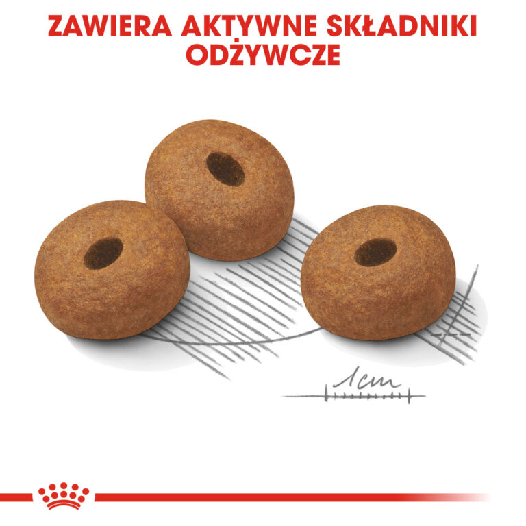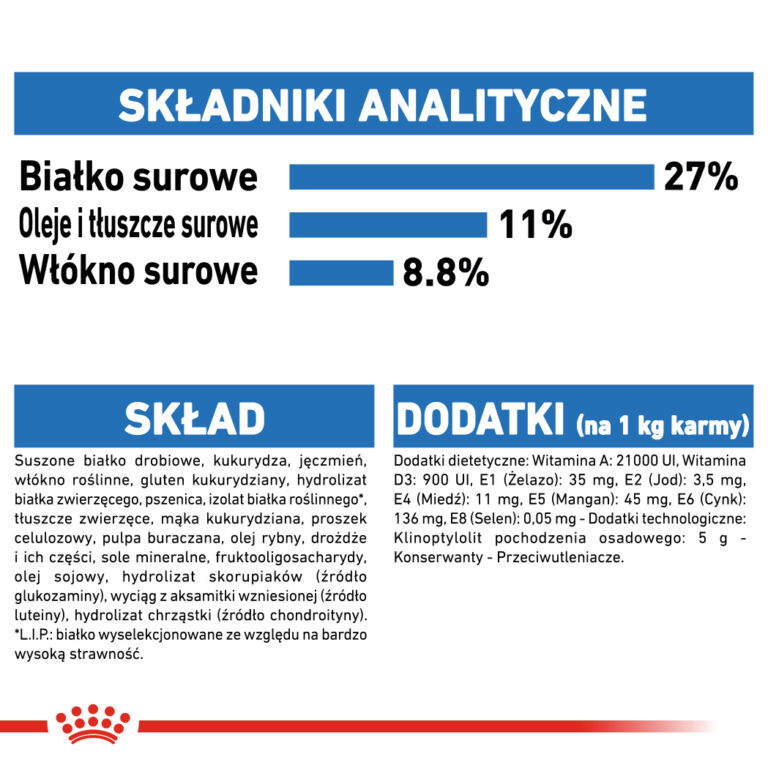białko drobiowe (suszone), kukurydza, jęczmień, lignoceluloza, gluten paszowy kukurydziany, białko zwierzęce (hydrolizowane), pszenica, izolat białka roślinnego*, tłuszcz zwierzęcy, śruta kukurydziana, proszek celulozowy, suszone wysłodki buraczane, olej rybi, drożdże i ich części, składniki mineralne, fruktooligosacharydy, olej sojowy, hydrolizat ze skorupiaków (źródło glukozaminy), mączka z kwiatu aksamitki (źródło luteiny), hydrolizat z chrząstki (źródło chondroityny)