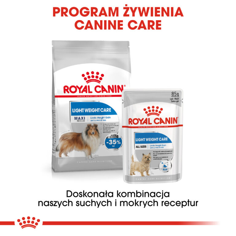 Program żywienia Light Weight Care obejmuje dwa produkty. Zarówno chrupiące krokiety, jak i delikatny pasztet są optymalnie zbilansowane i kompletne, stanowiąc wspaniałe zestawienie. Podaj psu delikatny pasztet w połączeniu ze smakowitymi krokietami!