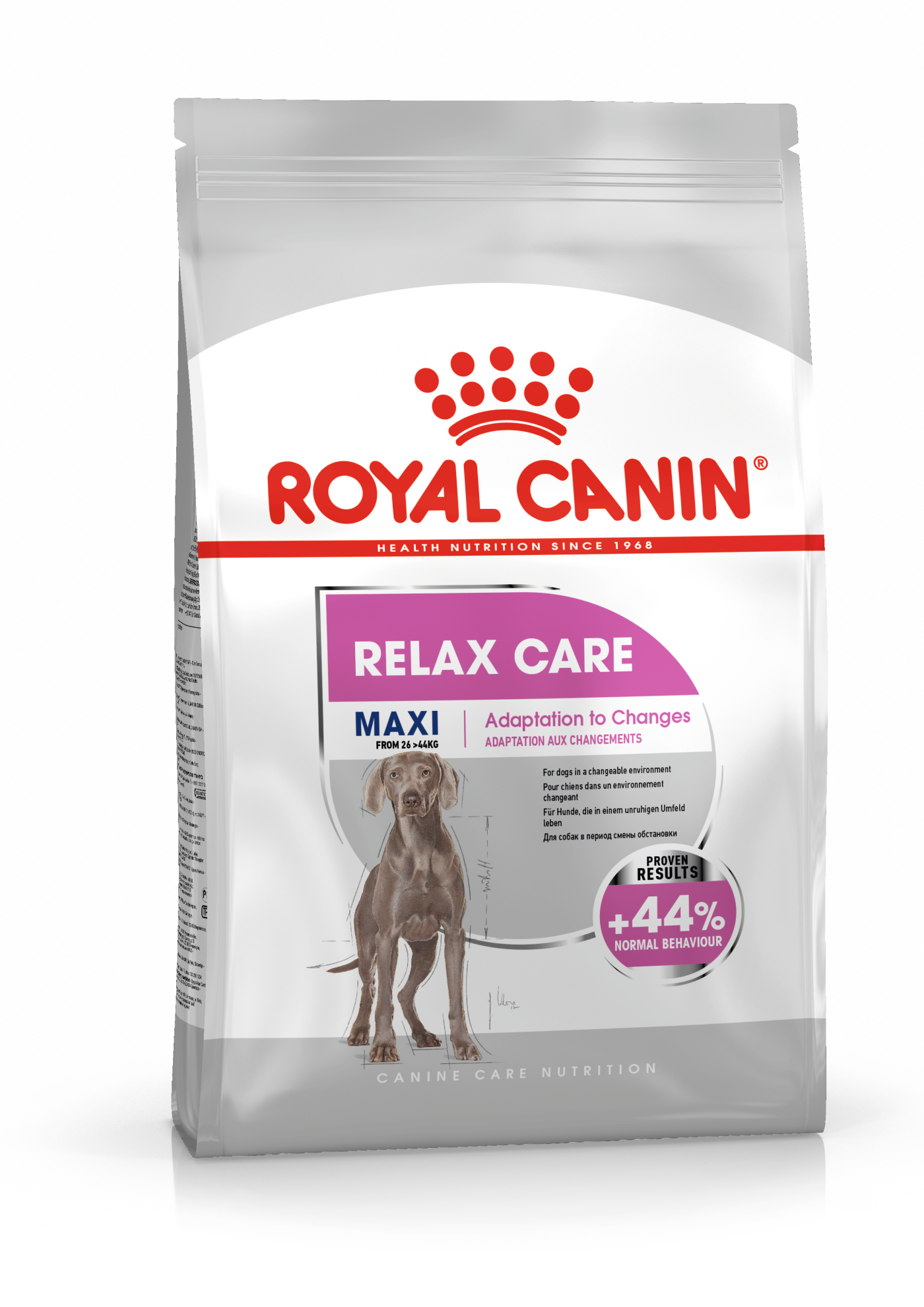 Unikalna receptura o wysokiej smakowitości zawiera wysokiej jakości aktywny składnik pokarmowy naturalnego pochodzenia w przyswajalnej formie, kojący napięcie nerwowe. Ponadto, podczas produkcji regularnie prowadzone są dokładne kontrole formy, ilości i jakości tego ważnego dodatku. Karma ROYAL CANIN® Relax Care Maxi, odpowiednia dla psów dorosłych o masie ciała od 26 do 44 kg, łagodzi reakcję twojego psa na zmiany środowiskowe. Wszystkie karmy Royal Canin są pełnoporcjowe, co oznacza, że w 100% pokrywają zapotrzebowanie organizmu na wysokiej jakości białka, tłuszcze, włókno, witaminy i składniki mineralne, potrzebne dla zdrowia i dobrego samopoczucia twojego psa.