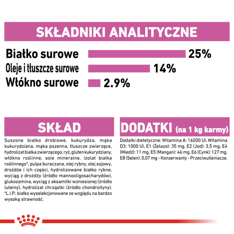 suszone białko drobiowe, kukurydza, mąka kukurydziana, mąka pszenna, tłuszcze zwierzęce, hydrolizat białka zwierzęcego, ryż, gluten kukurydziany, włókno roślinne, sole mineralne, izolat białka roślinnego*, pulpa buraczana, olej rybny, olej sojowy, drożdże i ich części, hydrolizowane białko rybne, wyciąg z drożdży (źródło mannooligosacharydów), glukozamina, wyciąg z aksamitki wzniesionej (źródło luteiny), hydrolizat chrząstki (źródło chondroityny).
