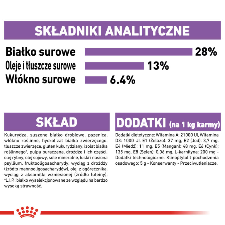 Dodatki (na 1 kg karmy): Dodatki dietetyczne: Witamina A: 21000 UI, Witamina D3: 1000 UI, E1 (Żelazo): 37 mg, E2 (Jod): 3,7 mg, E4 (Miedź): 11 mg, E5 (Mangan): 48 mg, E6 (Cynk): 135 mg, E8 (Selen): 0,06 mg, L-karnityna: 200 mg - Dodatki technologiczne: Klinoptylolit pochodzenia osadowego: 5 g - Konserwanty - Przeciwutleniacze.