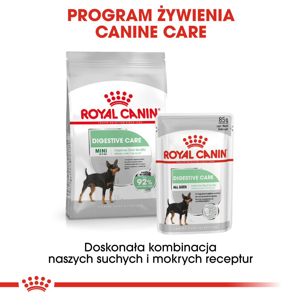 RC Mini Digestive Care jest karmą pełnoporcjową, przeznaczoną dla dorosłych psów o wrażliwym przewodzie pokarmowym. W związku z tym, specjalnie dobrane składniki wspomagają procesy trawienia i wchłaniania pokarmu. Szczególnie psy ras małych mają tendencję do bardziej zwartego kału, co może prowadzić do zaparć. Receptura uwzględnia te specyficzne potrzeby. W związku z tym, posiada optymalną kombinację rozpuszczalnego i nierozpuszczalnego włókna pokarmowego. Dzięki temu pomaga ograniczyć fermentację bakteryjną w jelitach oraz odpowiednio do potrzeb wspomaga prawidłowy pasaż jelitowy. Dodatkowo prebiotyki sprzyjają utrzymaniu prawidłowej mikroflory jelitowej. Ponadto wyselekcjonowane białka (L.I.P) zapewniają doskonałą strawność produktu.