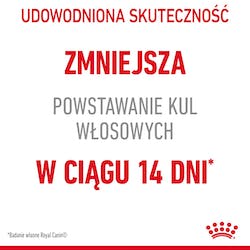 Udowodniona skuteczność: wydalenie dwukrotnie większej ilości połkniętych włosów po 14 dniach podawania kotu wyłącznie karmy Royal Canin.