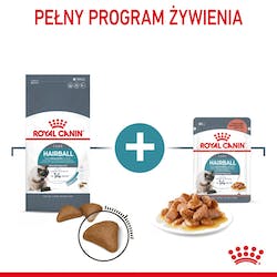 Karma Royal Canin Hairball Care to precyzyjna kombinacja składników pokarmowych, charakteryzująca się wysokim poziomem białka (34%) oraz tłuszczu (15%). Zalecana dla dorosłych kotów, w celu naturalnej eliminacji kul włosowych z przewodu pokarmowego.