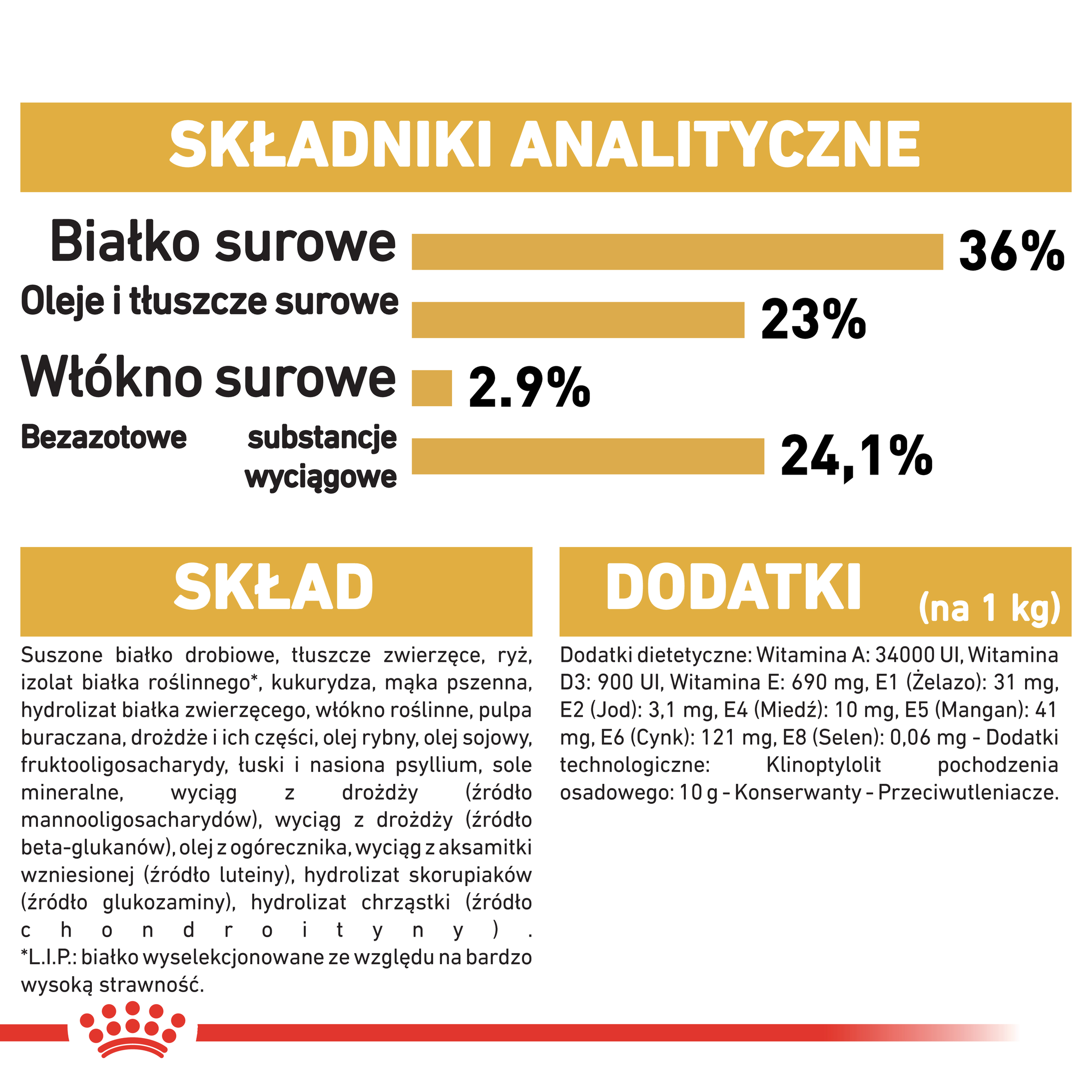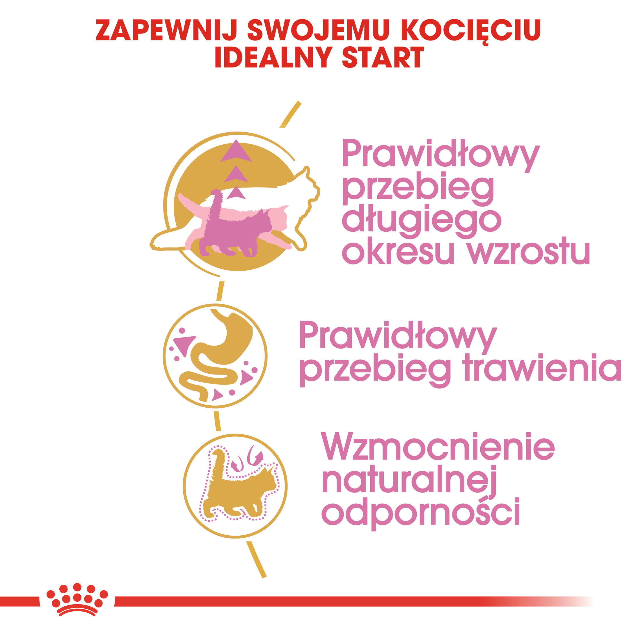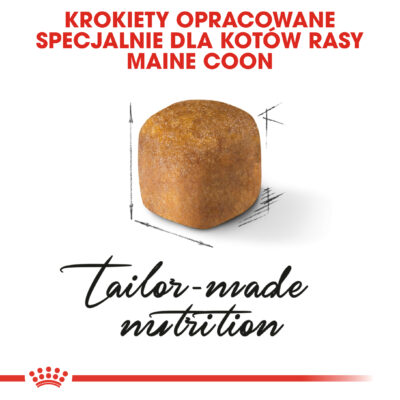 ROYAL CANIN® Maine Coon Kitten to karma opracowana specjalnie dla kociąt rasy maine coon – do 15 miesiąca życia. Odpowiednio dostosowana dieta dba o prawidłowy rozwój kocięcia przez cały okres wzrostu. Układ pokarmowy kocięcia cały czas się rozwija. Dla prawidłowego przebiegu trawienia ważne są białka wysokiej jakości. Karma ROYAL CANIN® Maine Coon Kitten zawiera wysokostrawne białka L.I.P. oraz prebiotyki sprzyjające równowadze flory bakteryjnej jelit.