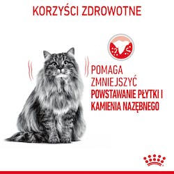 Doskonale zbilansowana karma Royal Canin Oral Care sprzyja higienie jamy ustnej oraz redukcji odkładania kamienia nazębnego. W związku z tym produkt jest wyposażony w podwójny mechanizm, który eliminuje kamień nazębny.