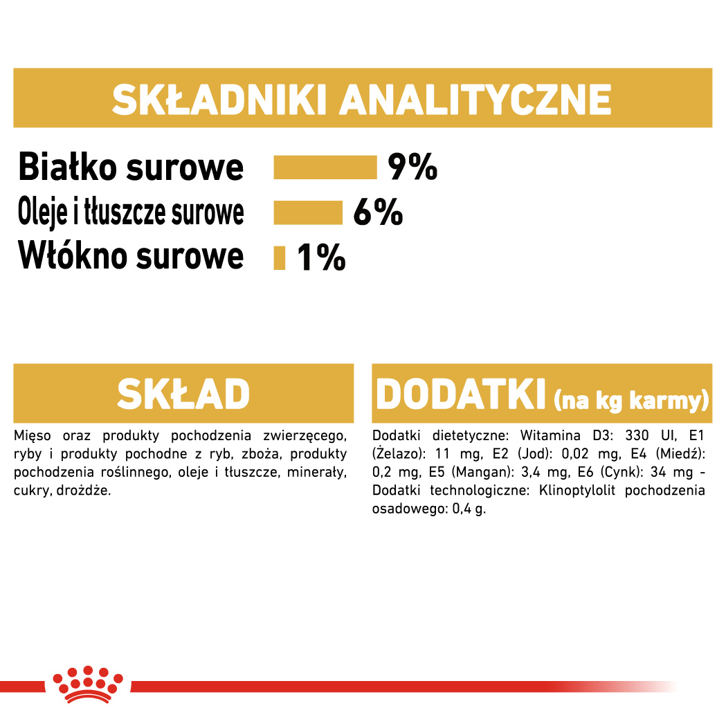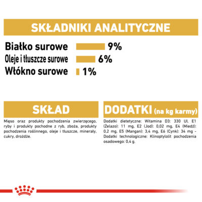 Ekskluzywny kompleks składników pokarmowych zawarty w karmie mokrej ROYAL CANIN® Persian Adult sla kotów dorosłych powyżej 12 miesiąca życia, pomaga wzmacniać nieprzepuszczalność bariery skórnej oraz sprzyja zdrowiu skóry i pięknej sierści. Forma smakowitego pasztetu, dostosowana do budowy czaszki oraz sposobu pobierania pokarmu, pobudza apetyt kotów perskich. Receptura karmy sprzyja prawidłowemu przebiegowi trawienia, dzięki wysokostrawnym białkom, unikalnej kompozycji włókna pokarmowego oraz odpowiedniej zawartości witamin i soli mineralnych.