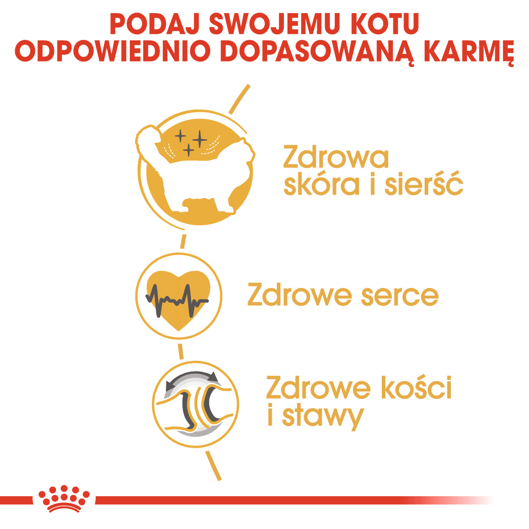 Karma ROYAL CANIN® Ragdoll Adult dla kotów dorosłych powyżej 12 miesiąca zycia, pomaga utrzymać zdrową skórę i piękną sierść, dzięki wyjątkowej kompozycji składników pokarmowych, w tym aminokwasów, witamin oraz kwasów tłuszczowych omega 3 i omega 6.