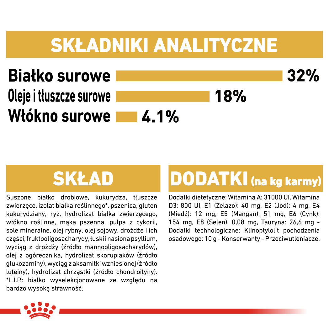 suszone białko drobiowe, kukurydza, tłuszcze zwierzęce, izolat białka roślinnego*, pszenica, gluten kukurydziany, ryż, hydrolizowane białko zwierzęce, lignoceluloza, mąka pszenna, włókna cykorii, składniki mineralne, olej rybny, olej sojowy, drożdże i ich części, fruktooligosacharydy, babka płesznik (łuski i nasiona), wyciąg z drożdży (źródło mannanoligosacharydów), olej z ogórecznika, hydrolizat ze skorupiaków (źródło glukozaminy), wyciąg z aksamitki wzniesionej (źródło luteiny), hydrolizat z chrząstki (źródło chondroityny)