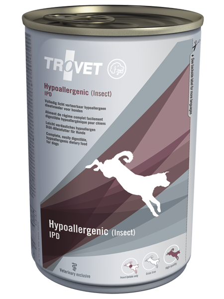 Trovet Hypoallergenic Insect IPD – 400g puszka dla psa. Holenderska marka Trovet została wprowadzona na rynek pod koniec lat 80 – tych. Bez wątpienia tak ogromne doświadczenie w wytwarzaniu żywności dla zwierząt pozawala tworzyć produkty specjalistyczne i dostosowane do potrzeb organizmu na każdym etapie życia. Z pewnością, wieloletnia wiedza na temat żywienia, pozwala stale aktualizować produkty w oparciu o najnowsze badania w tej dziedzinie. Również każda nowa, wprowadzana przez markę karma, to produkt innowacyjny, spełniający standardy najnowszej dostępnej wiedzy z zakresu żywienia. Przede wszystkim, specjalizacją marki jest produkcja diet leczniczych, które wspomagają zwierzęta w walce z różnego typu schorzeniami. W związku z tym produkty spełniają wysokie standardy jakości, nie zawierają sztucznych barwników i konserwantów. Dlatego często stają się ważnym składnikiem skutecznej terapii.