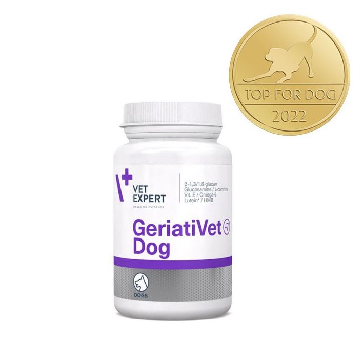 Suplement diety Geriativet Dog to preparat wspomagający dla starszych psów, powyżej 7 roku życia. Wspiera prawidłowe funkcjonowanie kluczowych układów w organizmie i zmniejsza ryzyko wystąpienia problemów zdrowotnych związanych z wiekiem. Zastosowane substancje wspomagają odporność, wzrok, pracę serca i stawów. Glukozamina pomaga zmniejszyć zmiany zwyrodnieniowe stawów, L-karnityna poprawia spalanie tłuszczu w komórkach, HMB chroni komórki mięśni szkieletowych przed zniszczeniem i ułatwia zachowanie masy mięśniowej, beta-glukan wspomaga odporność i chroni przed infekcjami a luteina dzięki swoim właściwościom przeciwutleniającym chroni wzrok.