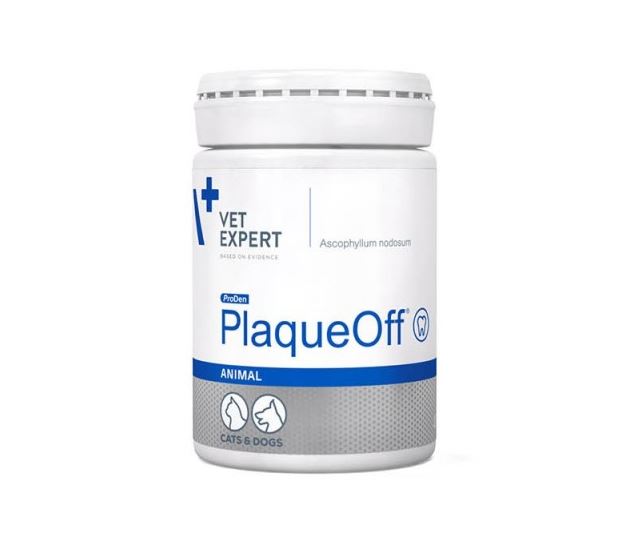 Suplement diety Plaque Off to skuteczny preparat do higieny jamy ustnej dla psów i kotów. Przeznaczony do codziennego stosowania w celu ograniczania odkładania się płytki nazębnej i powstawania kamienia. Skutecznie neutralizuje nieprzyjemny zapach z jamy ustnej. Preparat PlaqueOff® zyskał pozytywną rekomendację Sekcji Stomatologii Polskiego Stowarzyszenia Lekarzy Weterynarii Małych Zwierząt.