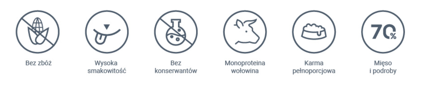 Adult Dog Beef to pełnoporcjowa karma w puszcze dla dorosłych psów wszystkich ras. Jej największym atutem jest eliminacja ze składu zbóż i glutenu oraz wysoka zawartość mięsa i podrobów wołowych, na poziomie 70%. Dzięki zawartości tylko jednego źródła białka, czyli mięsa wołowego, pozwala ograniczyć ryzyko wystąpienia niestrawności czy alergii pokarmowych. W psiej diecie wołowina to mięso pełne białka wysokiej jakości. A do tego oferuje żelazo, cynk oraz selen. Zawiera również witaminy z grupy B oraz witaminy A i E. Witamina B1 wspomaga układ sercowo naczyniowy i wpływa na prawidłowy rozwój kości. B12 z kolei bierze udział w wytwarzaniu erytrocytów oraz serotoniny, a także syntezie białek. Witamina B6 ułatwia wchłanianie białka. Witamina A wpływa korzystnie na skórę oraz wzrok. Żelazo zapobiega anemii, odpowiada za procesy krwiotwórcze, funkcjonowanie szpiku kostnego, układu odpornościowego i nerwowego. Kwas linolowy poprawia metabolizm.