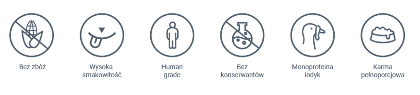 - prosty skład – jedno źródło białka – indyk