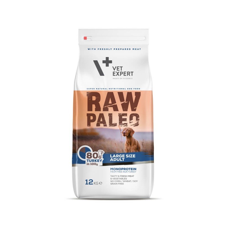 VetExpert RAW PALEO Adult Large Turkey to pełnoporcjowa sucha karma dla psów dużych i olbrzymich, których waga przekracza 25kg. Monobiałkowa, w 80% przygotowana z indyka spełniającego kryteria spożycia dla człowieka, wolna od zbóż i glutenu