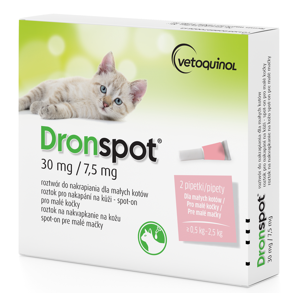 Vetoquinol Dronspot 30 mg/7,5 mg to środek przeciwpasożytniczy o szerokim spektrum działania, przeznaczony do leczenia mieszanych inwazji pasożytniczych u małych kotów, o wadze do 2,5 kg.