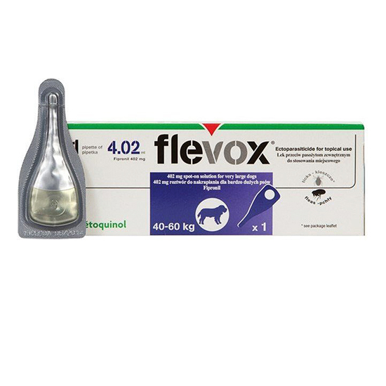 Vetoquinol Flevox Spot-On XL to środek przeciw pchłom i kleszczom, dla psów o wadze od 40kg do 60kg. Produkt zapewnia skuteczną ochronę przed rozmnażaniem i nową infestacją dorosłymi postaciami pcheł przez okres do 8 tygodni, przed kleszczami przez okres 4 tygodni oraz przed wszołami.