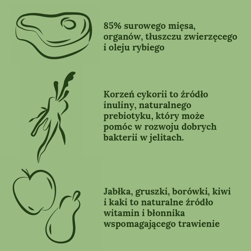 • Zbilansowana, kompletna, surowa dieta dla zwierząt domowych pochodząca z najlepszych naturalnych składników