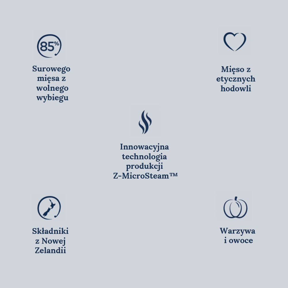 Ziwi Peak Steam&Dried to bez wątpienia najwyżej jakości karma, wytwarzana w 85-90% z surowego mięsa, organów i owoców morza, z dodatkiem zdrowych owoców i warzyw. Z zastosowaniem najnowszej technologii Z-MicroSteam, która zapewnia w efekcie lekką, smaczną i delikatną konsystencję. Z-MicroSteam jest dwuetapową technologią, inspirowaną naturą. Obejmuje ona delikatne mikroparowanie – w celu uzyskania pysznej i delikatnej konsystencji oraz delikatne suszenie na powietrzu, by zapewnić optymalne odżywanie i smakowitość. Linia Steam&Dried przeznaczona jest dla właścicieli psów i kotów, którzy ponad wszystko, chcą zapewnić swoim pupilom bardziej holistyczną i inkluzywną dietę, z wykorzystaniem wysokiej jakości surowego mięsa oraz wartościowych owoców i warzyw.