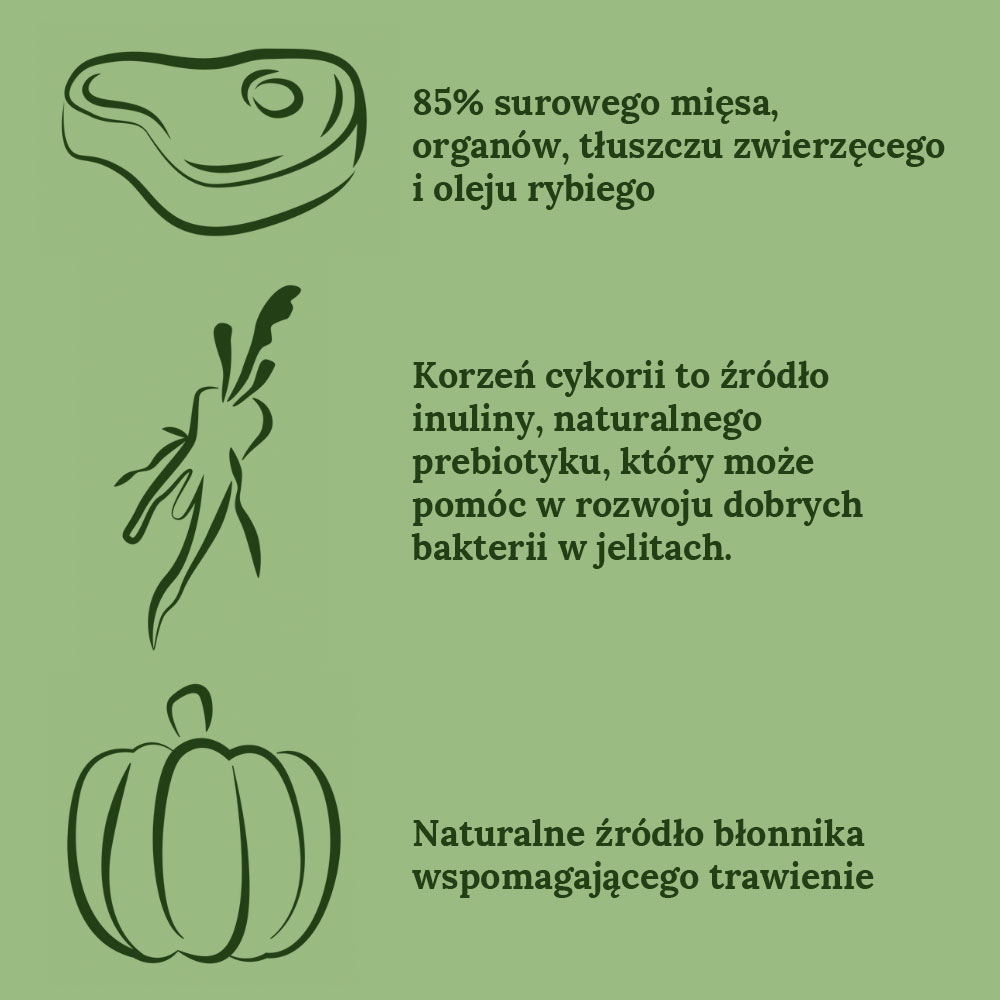 - Zbilansowana, kompletna, surowa dieta dla zwierząt domowych pochodząca z najlepszych naturalnych składników